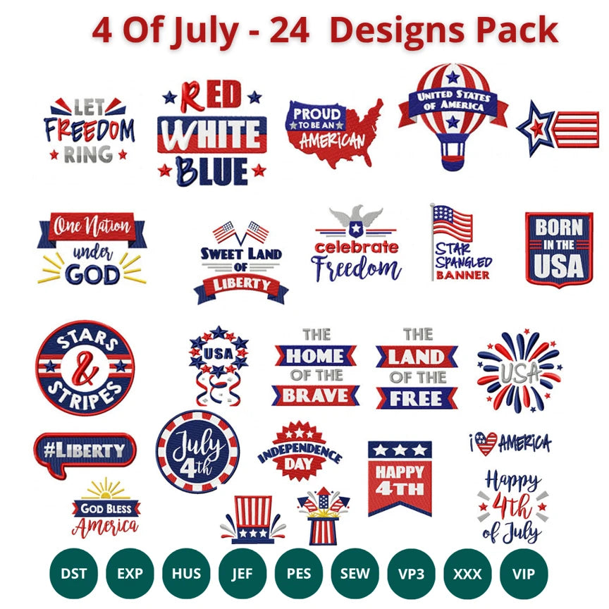 The 4 Of July – 24 Designs Pack was created from a deep appreciation for American heritage and the artistic symbolism surrounding Independence Day. Our design team sought to capture the bold, uplifting energy of July 4th—combining iconic patriotic elements with modern, expressive stitchwork.