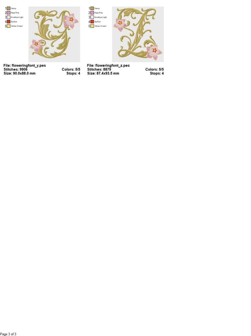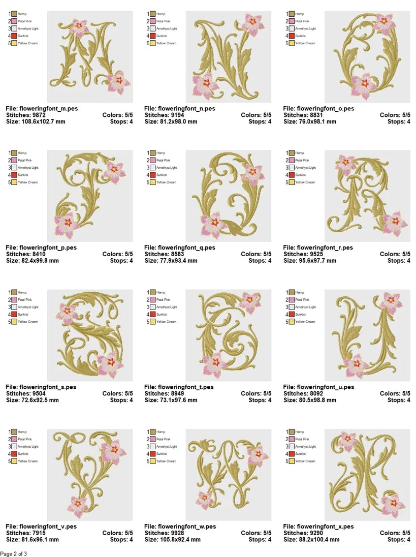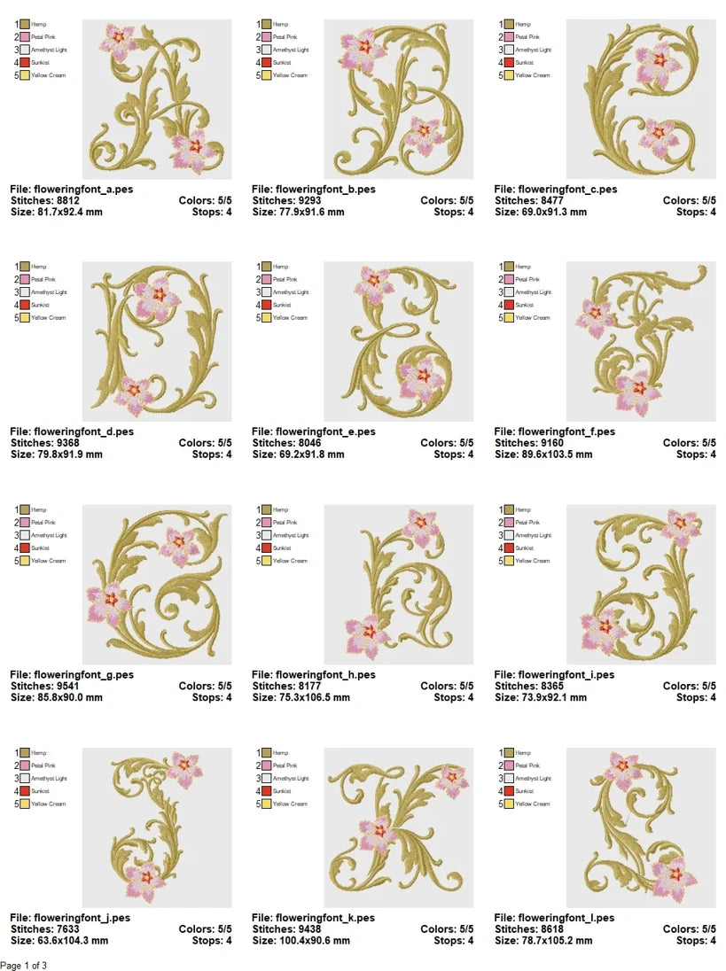 Each letter features intricately layered flourishes, elegant serif forms, and hand-drawn floral motifs, brought to life through five complementary thread colors. The collection is designed to produce luxurious results whether you’re monogramming formal linens, enhancing heirloom keepsakes, or adding a signature flourish to fashion pieces. The high-density stitch mapping and clean thread pathing ensure smooth execution across all compatible embroidery machines, including those using DST, PES, JEF, EXP, VP3, HUS, SEW, and XXX formats.