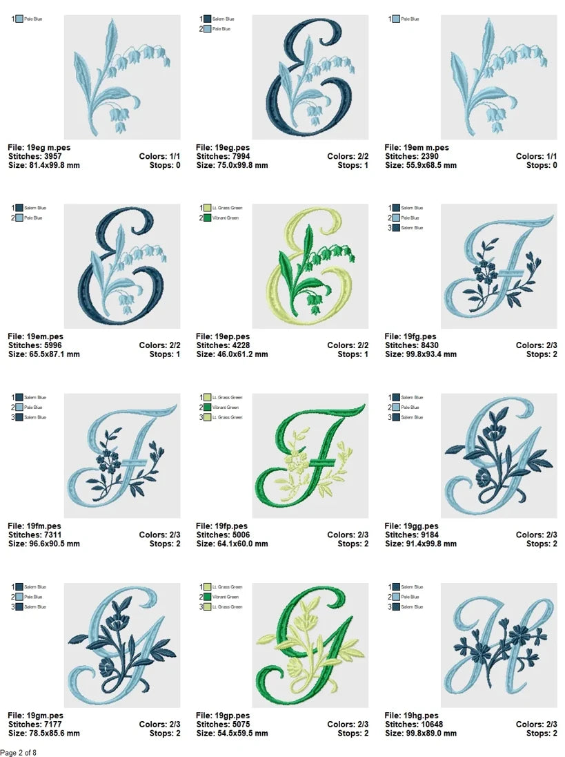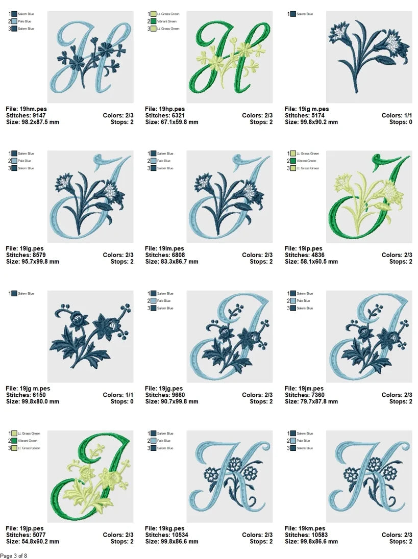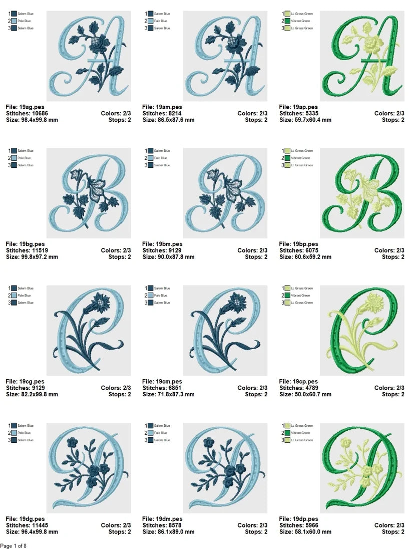 Each letter comes in multiple color schemes including soft blues and greens, and has been carefully digitized to ensure excellent stitch quality and minimal jump threads. You’ll find a balance of structure and elegance in every stitch—whether you’re working on linen, cotton, or decorative felt. The collection is fully compatible with all major embroidery machines and available in formats including DST, PES, JEF, EXP, VP3, HUS, SEW, and XXX.