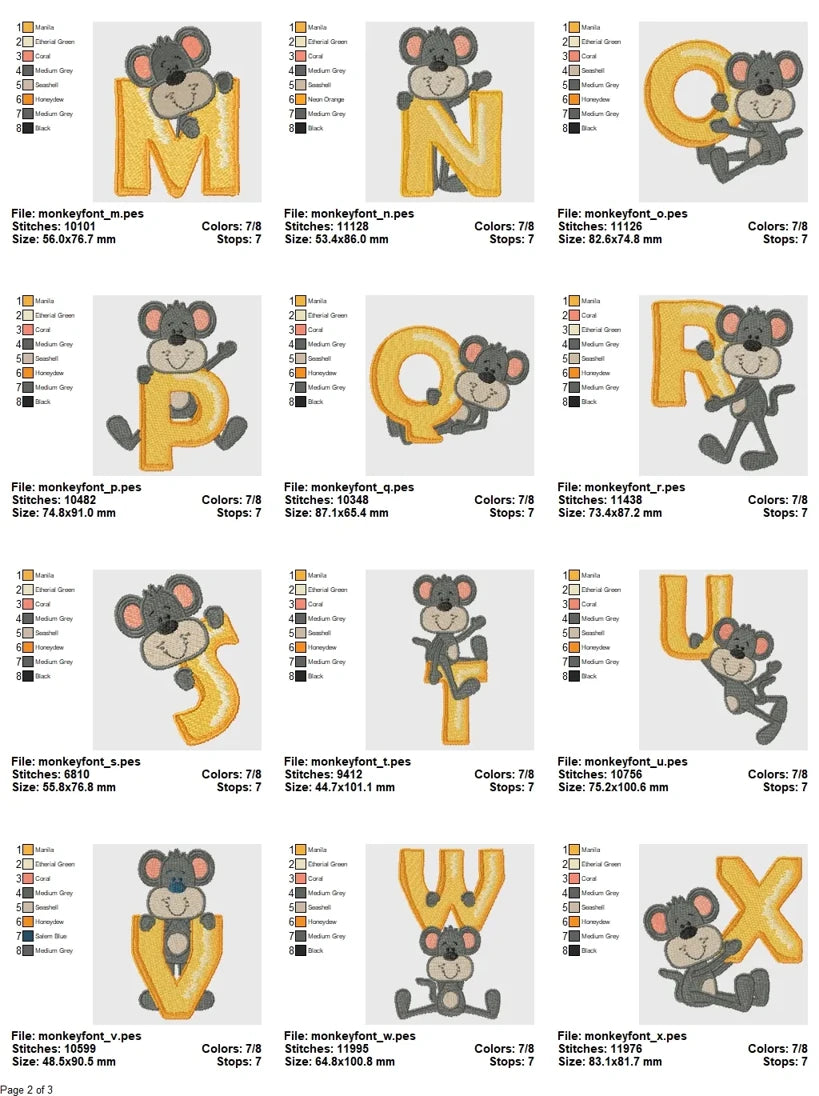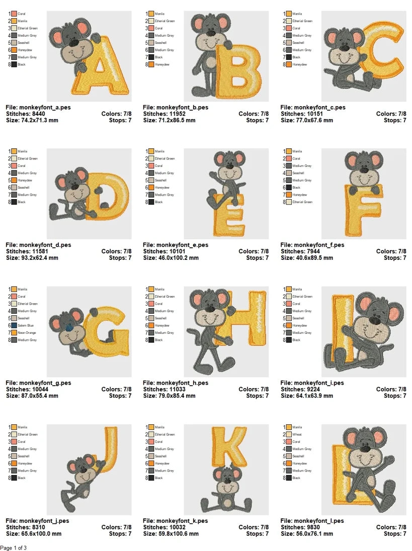 Designed by professional digitizers and tested across a wide range of fabric types, the Monkey Alphabet Embroidery Set ensures excellent results for both hobbyists and seasoned stitchers. The collection is available in all major formats and designed to run smoothly on all standard embroidery machines. With consistent sizes and balanced proportions, every letter stitches evenly and reliably for cohesive projects.