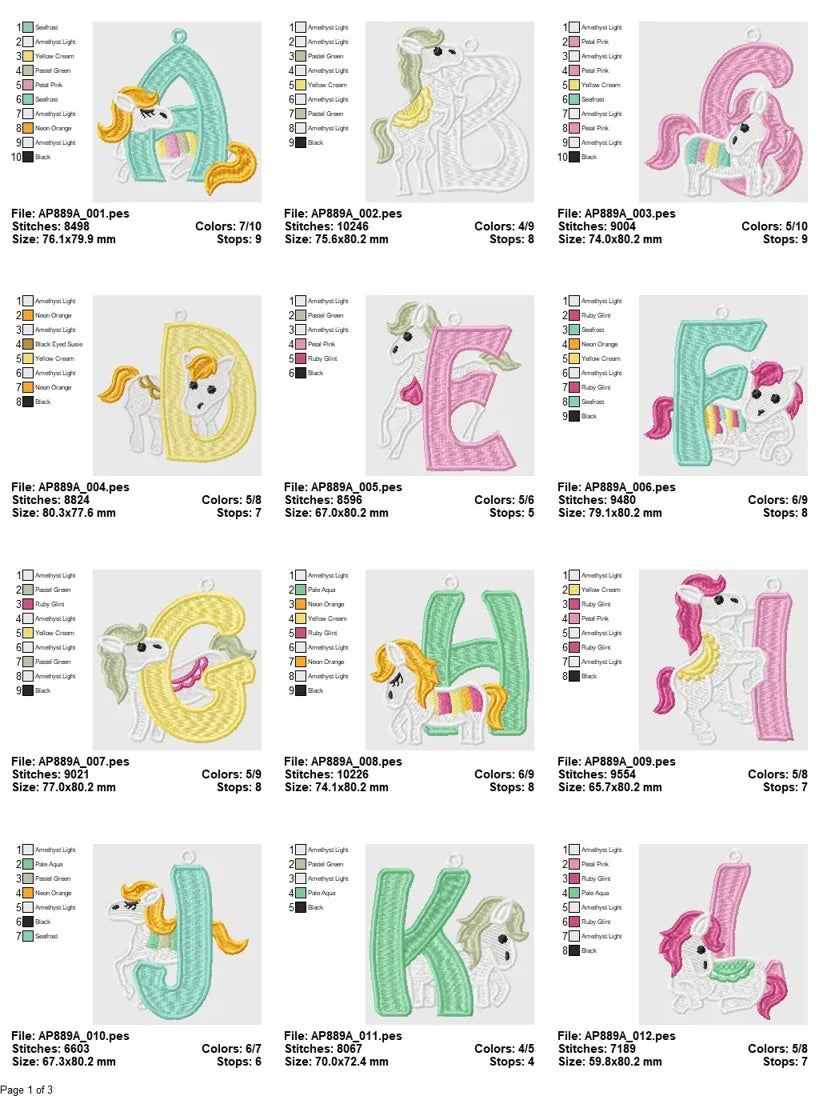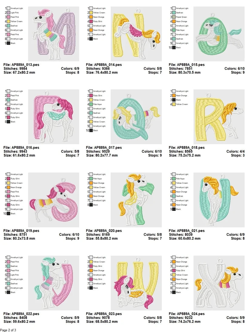 The Ponys Alphabet Embroidery Collection is professionally digitized to perform on all major embroidery machines. It supports formats including DST, EXP, HUS, JEF, PES, SEW, VP3, and XXX. With consistent sizing across the alphabet and playful, well-structured ponies standing proudly beside their letter companions, this collection is perfect for personalizing tote bags, quilts, pillows, banners, clothing, and more.